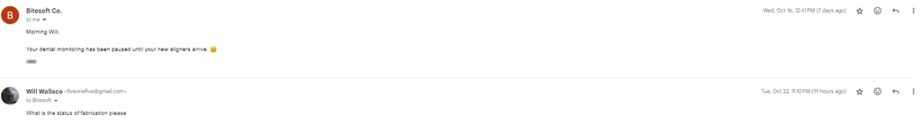 BiteSoft sent another mould kit to manufacture aligners. This kit was signed/delivered on the 18th July 2024 by my CSA. I sent an email on the 29th July 2024, asking for an update. I was told my treatment plan was being finalised and it would be available on the 30th July 2024. I heard nothing. I emailed on the 3rd August 2024, asking for another update. I was told it would be ready on the 4th August 2024. I heard nothing. I had to send a further two emails on the 8th and 9th August to be told my aligners are in fabrication, and will take 2 more weeks to make…