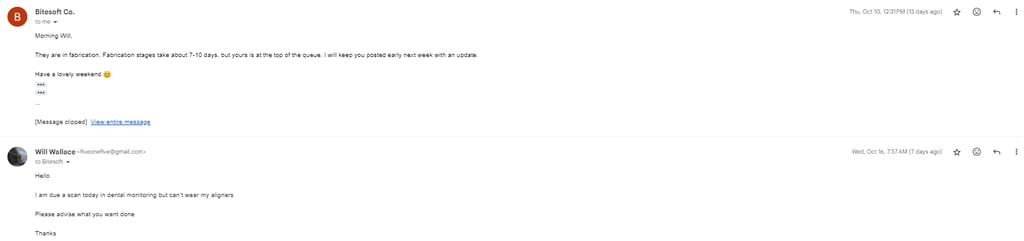 I immediately emailed BiteSoft after hours on the 2nd October to explain the situation. I messaged my CSA in the dental monitoring app as well.