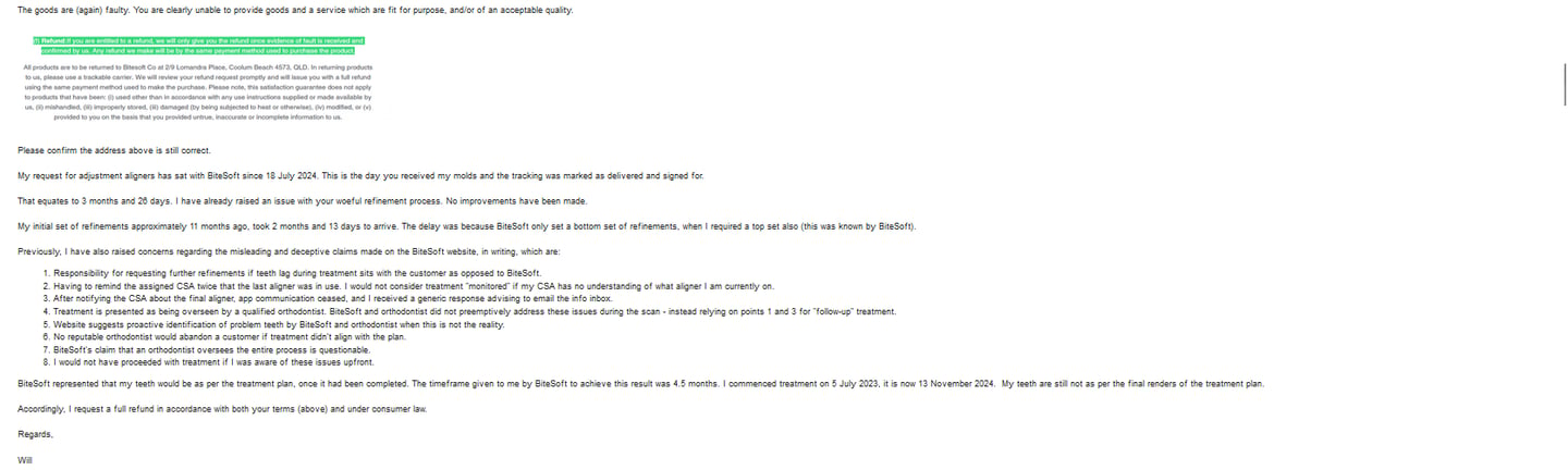 I followed the process again with my third set of adjustment aligners, sending my last scan on the 27th June 2024. I still needed adjustment aligners. I had told BiteSoft by this stage I thought it was poor-form to require the customer to request more adjustments when they were the ones implementing the treatment plan. BiteSoft asks you to identify which teeth you are not happy with, despite having a treatment plan which clearly identifies which teeth are not moving accordingly.